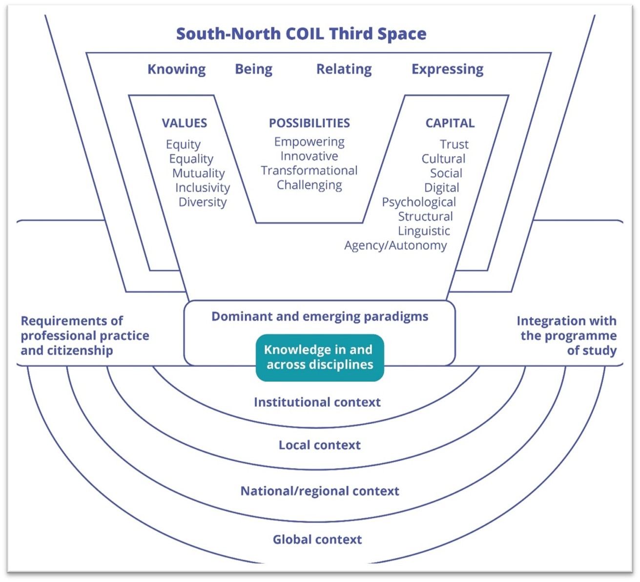 This study aims to research the evolving field of Collaborative Online International Learning (COIL) Higher Education (HE) through a Global South-North research project, focusing on female voices. COIL is defined as a collaborative online teaching and learning approach with international partners that fosters intercultural dialogue. This research project will evaluate a model of South-North COIL previously co-designed by the applicants (Figure 1) and based on an internationalisation of the curriculum framework developed by Leask and |Bridge (2013) against data generated through interviews with female stakeholders (academic staff and students) based in HE institutions in four different continents. The research aims to further the understanding of digital inclusion and equality in HE. It investigates COIL as a Third Space that promotes substantive equality and supports the integration of pluralistic perspectives and citizenship attributes in HE curricula, with a focus on women’s voices.